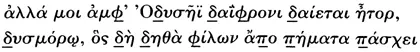 (But the heart in me is torn for the sake of wise Odysseus, unhappy man, who still, far from his friends, is suffering.)