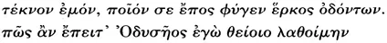 The juxtaposition of the words (Odysseus I) in line 65 suggests hyperbole, i.e., “Me!? Forget Odysseus?!" Zeus then points out what Athena has conveniently omitted, namely that Odysseus is hardly an innocent victim, but has earned Poseidon’s anger by blinding his son, Polyphemos (68–70). Having won the debate, Zeus amiably agrees to plan Odysseus’ return (76–77). Athena can scarcely believe her ears; so the gasping effect of the hiatus in line 83 seems to suggest as she utters the magic words, “Odysseus to return home" 2 She happily proposes that they send Hermes to Calypso and that she go to Ithaca (81–95). Her eagerness is deftly suggested by the fact that she does not wait for a reply at line 96, but immediately puts on her travelling shoes. The interplay between Zeus and Athena in this opening encounter presents us with subtle character drawing and serves notice to the audience that they must be sensitive at all times not only to what is said, but to how it is said; that, as in a drama, the interchange between characters is all-important. It is this aspect of the Odyssey more than any other which gives it its particular richness.3