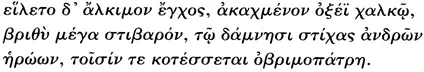 (Then she caught up a powerful spear, edged with sharp bronze, heavy, huge, thick, wherewith she beats down the battalions of fighting
