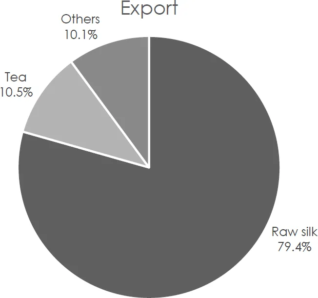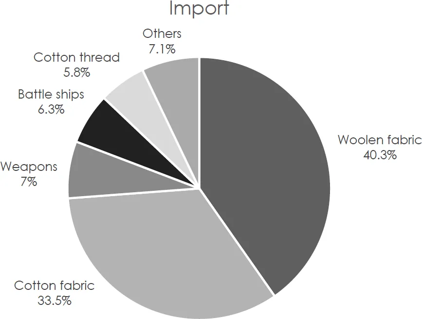 The opening of trade relationships had a great impact on the Japanese economy. Japanâs main export products included raw silk and tea and its main import products included woollen fabric, cotton cloth and military products (see Figure 1.1). While the growth of raw silk exports promoted the silk industry, the import of a large amount of cotton cloth negatively affected the domestic cotton textile industry (Beasley 1989: 306; Hane 1992: 69â70; Jansen 1989: 340). In addition, the difference in the ratios between gold and silver in Japan (1:5) and overseas (1:15) enabled foreign merchants to purchase gold much more cheaply in Japan and sell it more expensively outside Japan. As a result, a large amount of gold outflowed overseas from Japan (Hane 1992: 70). In response, the Bakufu reduced the amount of gold in coins but this devaluation led to a hyperinflation. This created ill-feeling towards foreign trade among Japanâs military nobility, the samurai, and led to the emergence of a radical philosophy and movement called son-nĆ jĆ-i (revere the emperor, expel foreign barbarians). However, jĆ-i (expel foreign barbarians) was replaced with tĆbaku (defeat the Bakufu) after fanatic samurai warriors realized the impossibility of expelling western imperial powers and sought to blame the Bakufu instead for opening the country. Eventually, southern and western provinces of Satsuma and ChĆshĆ« formed a military coalition and conducted a coup dâĂ©tat to oust the Bakufu from power. Although the last ShĆgun Yoshinobu proposed to surrender power to the imperial court on the condition that a government centered on the Tokugawa clan would be formed in coalition with daimyĆ provincial lords, Satsuma and ChĆshĆ« announced the establishment of a new government centered on the Emperor (Hall 1971: 263â4; Hane 1992: 80â81). The new government defeated the Bakufu forces and the Tokugawa dynasty ended in 1868 with the restoration of power to the Emperor (Meiji Restoration). Edo was renamed Tokyo and replaced Kyoto as the new capital (the location of the imperial palace) of Japan in 1869.
