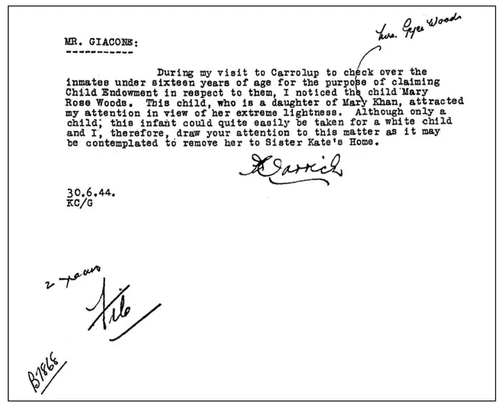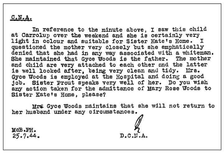 The Government papers document that I was taken from Carrolup Mission and placed as an inmate, at the tender age of two, into SKCH. I have no recollection of my time with my mother, but I take it we had a good relationship as mother and daughter. Apparently I had sores so they had to be cleared up before my removal and placement into Sister Kate’s. I don’t know how I travelled to Sister Kate’s, but I presume it was by car. My arrival in Queens Park doesn’t come to mind, and there is absolutely nothing I can recall about the journey or who looked after me.