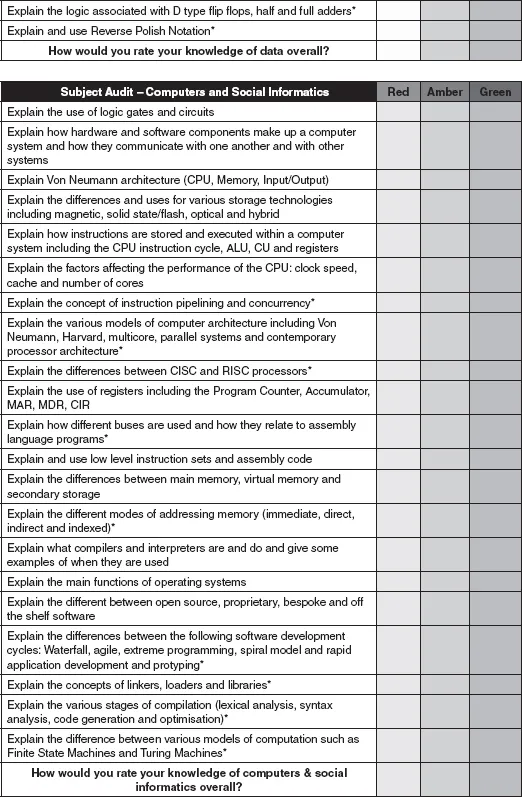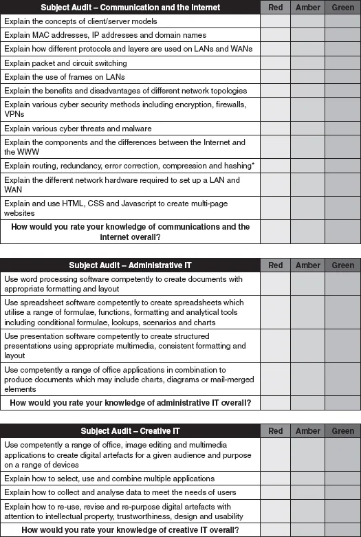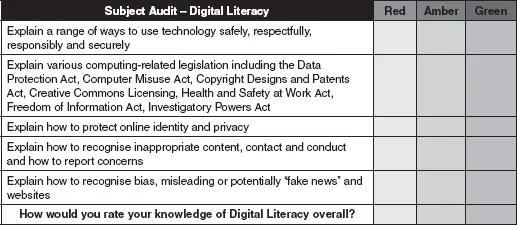 Shaun Lloyd created a useful subject audit for computing under a Creative Commons Attribution-ShareAlike 3.0 Unported CC BY-SA 3.0 Licence (Lloyd, 2015). Mark Dorling and Abigail Woodman also developed a computing skills and knowledge audit tool for the CAS QuickStart Computing continuing professional development (CPD) toolkit for secondary teachers (Dorling & Woodman, 2015). These have been modified to include IT and DL strands in Figure 1.1 on the following pages: