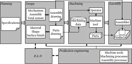 Figure 1.1 shows an example of a process flow, from specifications to products, in a general manufacturing industry. The manufacturing process can be divided into six stages based on function. They are planning, research and development (R&D), design, production engineering, machining, and assembly. Design, production engineering, machining, and assembly will be discussed in this chapter because an evaluation of technical skill is relatively easy in these processes.