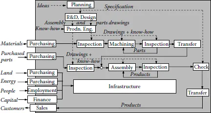 Although the overall information and materials flows are from upstream to downstream, from planning to assembly, they are not constantly in one direction. Parts are inspected along the way. If a fault is found, a part is returned to the point where the fault occurred and corrections are made. Or the cause of the fault is corrected. Such corrections may be considered to be the result of feedback. Finally, although the flows are shown as occurring sequentially in Figure 1.4, in reality all stages are occurring simultaneously, with different products at different stages of their manufacture.