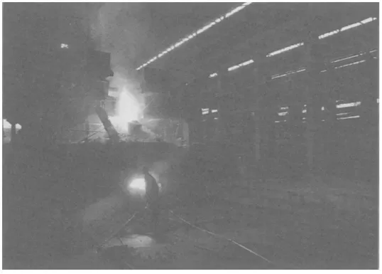 Making steel and pollution, Chongqing. A 1958 Soviet-built electric arc furnace emits bright flames, and a cloud of glowing ashes rises into the atmosphere. This furnace is scheduled to shut down at the end of 2002.
