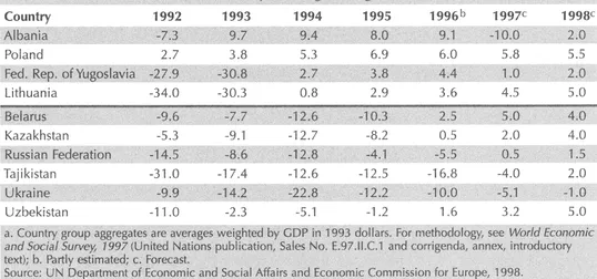 Economies in transition: Rate of growth of real GDP, 1992-1998 (annual percentage changea)