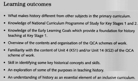 HMI identified seven objectives tor pupil progress in historical skills in a document published in 1985 (History in the Primary and Secondary Years). These still remain a good guide to identifying specific historical skills when planning a lesson. The document is well worth seeking out because it provides a linear progression for each skill.