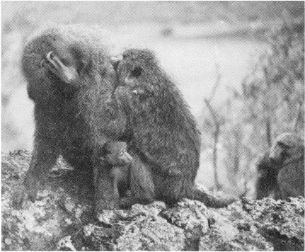 Alexander was facing west, his sharp muzzle pointing toward the setting sun, watching the rest of the troop make their way up the cliffs. Thalia was grooming herself in a perfunctory manner, her attention elsewhere. Every few seconds she glanced out of the corner of her eye at Alexander without turning her head. Her glances became longer and longer and her grooming more and more desultory until she was staring for long moments at Alexanderās profile. Then, as Alexander shifted and turned his head toward Thalia, she snapped her head down and peered intently at her own foot. Alexander looked at her, then away. Thalia stole another glance in his direction, but when he again glanced her way, she resumed her involvement with her foot. For the next 15 minutes, this charade continued: Each time Alexander glanced at Thalia, she feigned indifference, but as soon as he looked away, her gaze was drawn back to his face. Then, without looking at her, Alexander began slowly to edge toward Thalia. Their glances at one another became more frequent, the intervals between them shorter, and their interest in other events less convincing. Finally, Alexander succeeded in catching Thaliaās eye as she was turning away. He made a ācome-hitherā faceāthe same face Virgil had made at Pandoraāgrunting as he did so (Figure 1.1). Thalia froze, and for a second she looked into Alexanderās eyes. Then, as he began to approach her, she stood, presented her rear to him, and, looking back over her shoulder, darted nervous glances at him. Alexander grasped her hips, lip-smacking wildly, and then presented his side for grooming. Thalia, still nervous, began to groom him. Soon she calmed down, and I found them still together on the cliffs the next morning.