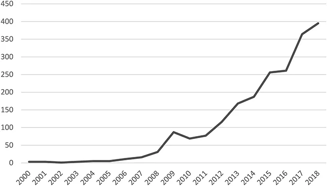 Source: Figure 1.1 reports the number of articles published in the years 2000â2018 that have either âfinancializationâ or âfinancialisationâ listed as keyword. The data presented here were collected from the Social Science Citation Index (Web of Science 2019). A search on article topics with either âfinancializationâ or âfinancialisationâ generated 2.112 article titles, which were subsequently grouped by year.