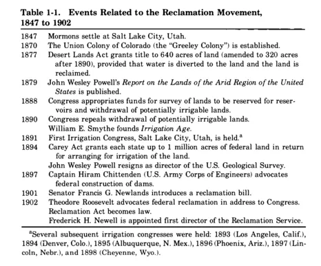 In fact, much of the settlement of the West was accomplished by private action. (Table 1-1 lists dates related to the history of the reclamation movement.) Even many of the principal irrigation developments were founded not by federal action, but by religious groups or other associations. For example, when the first group of Mormons arrived at Salt Lake Valley, Utah, in July 1847, they immediately set about diverting water to irrigation ditches and planting potatoes; by 1848 they had 5,000 acres of crops under irrigation (Golzé, 1952, p. 6).