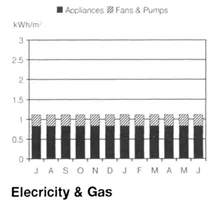 Energy-efficient appliances and lighting use only half the energy conventionally used. The full-size refrigerator consumes less than 30 kWh per month. All lighting is fluorescent and halogen; no incandescent lighting is used.