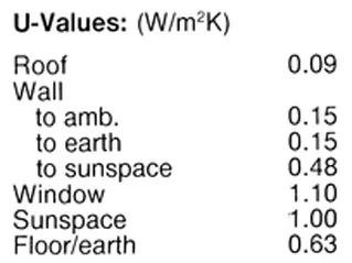 The building shell of the Brampton Advanced House is lightweight, well insulated and airtight. Walls are wood frame with 240 mm of wet-blown cellulose insulation and 25 mm of rigid fibreglass; the ceilings are insulated with 450 mm of blown cellulose. The concrete basement walls are insulated with 175 mm of blown cellulose and 50 mm of rigid insulation under the concrete floor. The wood-framed windows are triple-glazed with two low-e coatings, argon gas filled and have insulated spacers. A two-storey sunspace preheats ventilation air through ducts in the sunspace wall and floor slab.