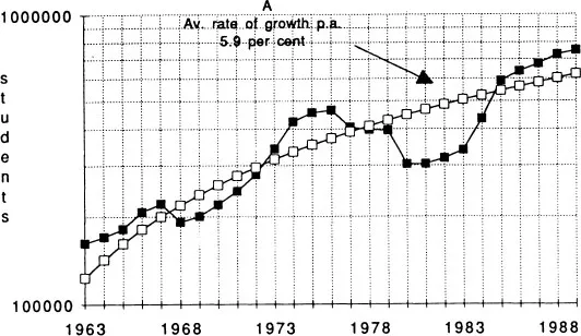 Fig. 1a. Actual and trend line of total student population in national universities 1963β1989.