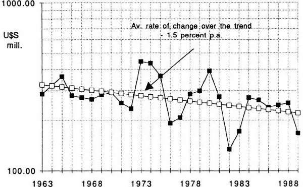 Fig. 1c. Actual and Trend Value of Per Student Expenditures National Universities 1963β1989.