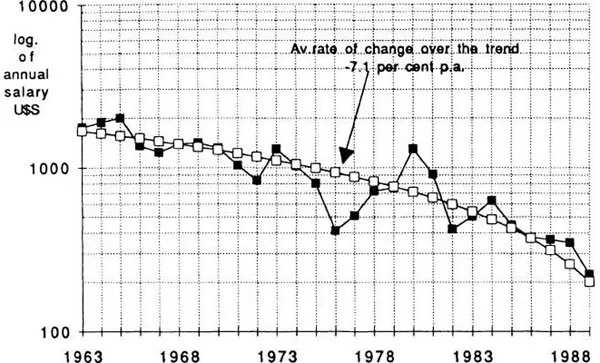 Economies of scale, that is, relative spending per student, are brought about when the student-teacher ratio increases (Psacharopoulos 1982). Letβs observe then the student-teacher ratio evolution in Argentina. A rather stable student-teacher ratio with a mean value of 22 and a standard deviation of 4.2 points was registered along the 1960β90 period; within the Β± one standard deviation range, values above the mean were found to concentrate in the early years while most values below the mean corresponded to the last years. This can be explained as follows: the average annual growth rate of the teaching force, of 7.1% as estimated from actual data, and calculated in terms of full-time equivalent units, remained on average slightly above that of the growth of student population (6.1%). Stability of the student teacher ratio was a direct result of this. The few βoutlayersβ, identified through regression analysis corresponded to specific periods: 2 points were above the standard range in 1966β67. These are related to the fact that the rate of increase in the teaching force decelerated sharply after the military coup of 1966. This resulted in higher student-teacher ratios for 1966 and 1967. In 1968, as entrance examinations started to be required, enrollment decreased and the student-teacher ratio resumed values within the historical range of 22 to 25 student per faculty member. A second important deviation relative to the trend values was registered in 1980β82, in coincidence with a combination of social and economic events, including the Falkland war of 1982, and a drastic deterioration in the prevailing economic conditions that resulted in a heavy restraint in public finance. Tuition fees were introduced at the national universities and enrollments registered values well below those corresponding with the trend. This time, the student-teacher ratio dropped, to reach an all time low of 15β16 only to resume its historical trend value soon after the Alfonsin administration took power, in December 1983. The last figure registered, corresponding to 1988, indicates a ratio below the range of values. This time, it can be attributed to a new slackening in the growth of the teaching force associated now with the deteriorated conditions of the academic labor market.