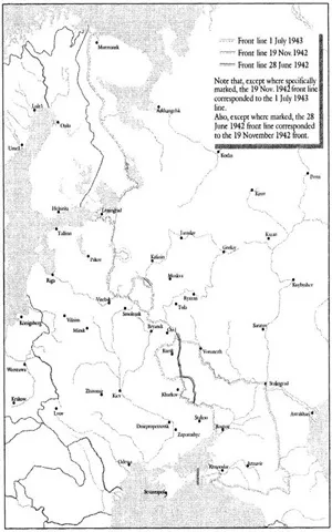 In the Army Group North area the number of infantry divisions was 38, while only one panzergrenadier division and not a single panzer division was subordinated to the army group.33 In addition it had three Jäger divisions and one mountain division, which at least had somewhat better mobility than the infantry divisions. This was clearly not sufficient to mount a truly mobile defence at army-group level; neither did the terrain favour mobile operations. The final nail in the mobile defence coffin for Army Group North was Leningrad. It was unthinkable that Hitler would loosen the German grip on this city, even though it had been dented in January 1943, when the Red Army had opened a narrow land corridor to the besieged city.