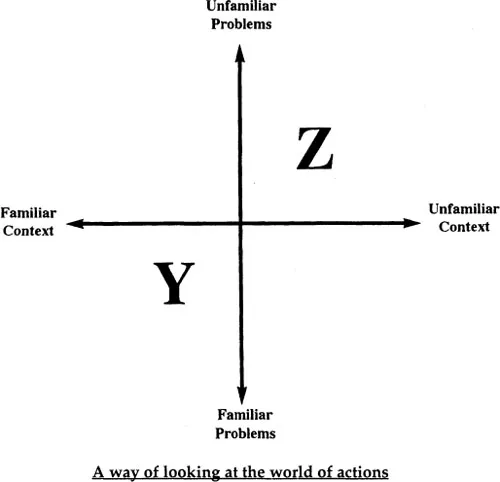 In position Z we have to take much more responsibility for our own learning. By definition, we must inform ourselves about the unfamiliar context and not simply remind ourselves of what we were taught or trained to do. By definition, we must formulate the problems we have to deal with, not remind ourselves of problems previously learned. We must devise solutions and ways of applying them without the certainty of knowing the outcome, as a way of learning more about both the context and the problem. We need confidence in our ability to learn about the new context and to test possible ways forward from which we can learn. We need confidence in ourselves, and in our judgements, if we are to take actions in uncertainty and to see initial failure as a basis of learning how to do better.