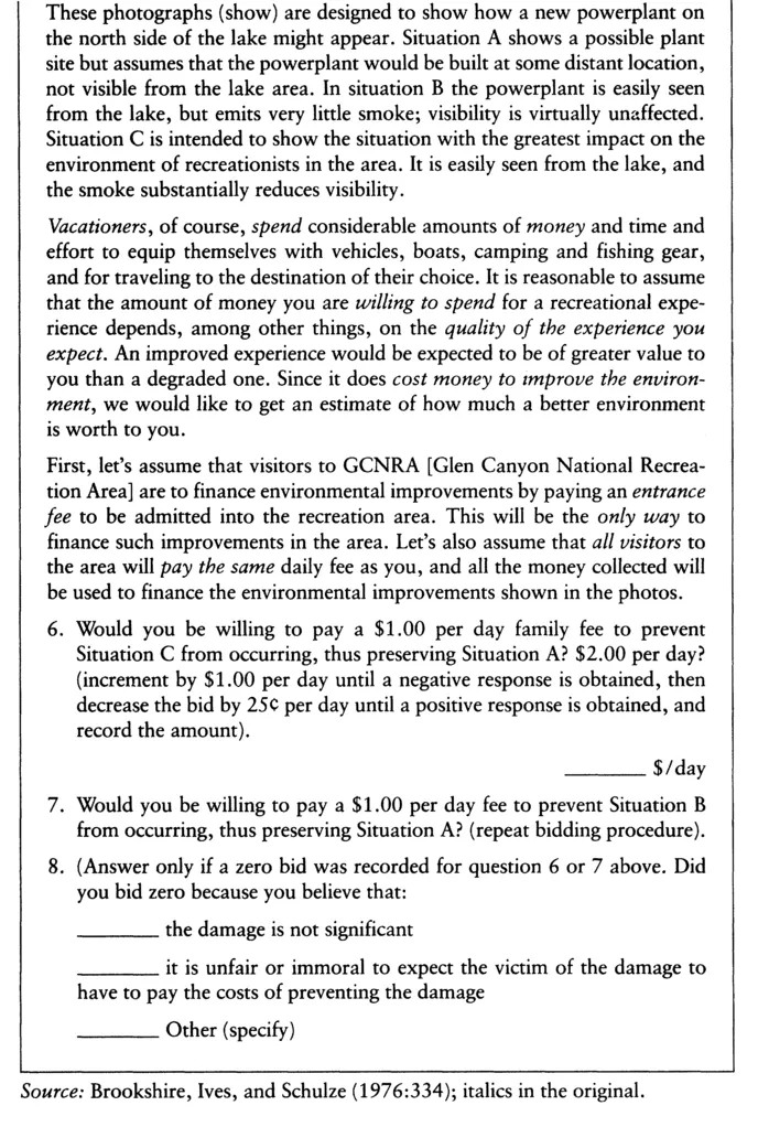 the aesthetic impact of a proposed power plant on the north shore of the Lake Powell recreational area in Utah. The amenity the respondents were asked to value was the aesthetic benefit of having their view of Lake Powell unobstructed by the visible presence of a power plant and the smoke from the plant. The researchers used sets of specially created photographs to depict the baseline view and two levels of impairment. Situation A represented the view without the power plant. The photographs for situation B showed only some smoke from the hypothetical power plant, which itself was not in view. The photographs for C showed the plant, in addition to a greater amount of smoke. The respondents were asked to say how much they were willing to pay to preserve situation A, first from the degradation represented in B, then from situation C. The elicitation method used in this study is known as the bidding game, an iterative technique illustrated in question 6 in figure 1-1. The payment vehicle was a hypothetical entrance fee to the recreation area.