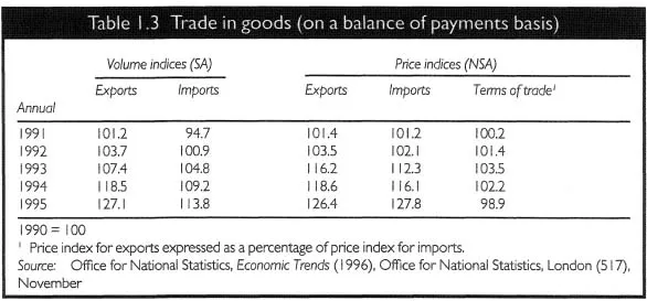 The UK share of world trade has decreased from around 25 per cent, at the end of the nineteenth century to approximately 6.5 per cent of global exports and imports today. Nevertheless, the UK still earns a greater, although declining, percentage of its GDP from exports than many other major industrial countries. At the same time the need toimport raw materials plus half its food needs, underlines Britains dependency on foreign trade. Table 1.3 shows that if we focus particularly on the export sector, we find that exports indexed over 1990 levels have been increasing in both volume and value.