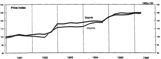 It is interesting to note, from Table 1.3, that imports are now down and overtaken by exports first in volume then in price. This is emphasized in the last column, āTerms of Tradeā, and is depicted in Figure 1.2.