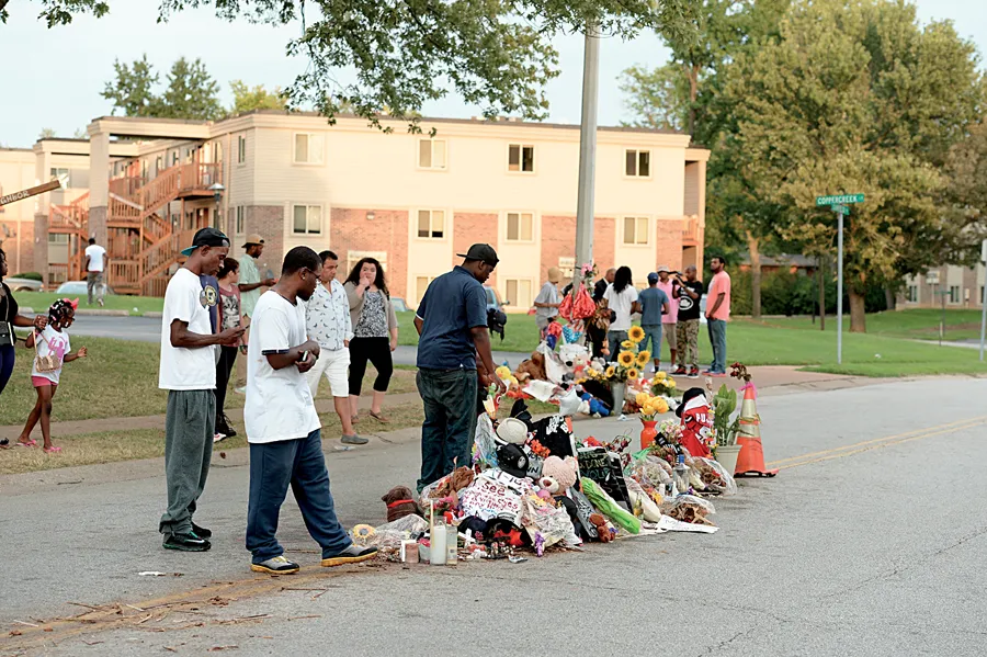 Four years after the killing of eighteen-year-old Michael Brown by a Ferguson police officer, Brownâs father led the rebuilding of a street memorial on the spot where his son had been shot to death. Immediately after his death in 2014, there were several makeshift memorials for Brown, consisting of stuffed animals, baseball caps, candles, balloons, and flowers. These were destroyed several times. One memorial burned while police watched and claimed they could not put out the fire; another memorial was driven over. A tree and dedication marker planted in a nearby park were vandalized when part of the tree was cut off and the marker stolen. Ferguson police representative Timothy Zoll described a new memorial on Canfield Drive around a telephone pole near the spot where splotches of Brownâs blood still stained the street as âa pile of trash.â He was suspended after the Washington Post quoted him. Each time the street memorial was destroyed, members of the community rebuilt it, and protests against the killing went on for months. In 2015, a year after Brownâs death, the city finally embedded a permanent memorial plaque in the sidewalk near the spot where he was killed.1 This, however, did not prevent the rebuilding of the street memorial in 2018 on the fourth anniversary of the killing, one of several commemorative events. The street memorial keeps Brownâs memory alive, invoking the presence of the departed, the injustice of his death, the grief of the bereaved, and the importance of place when a violent and sudden death has occurred, and communicates all this with the public.
