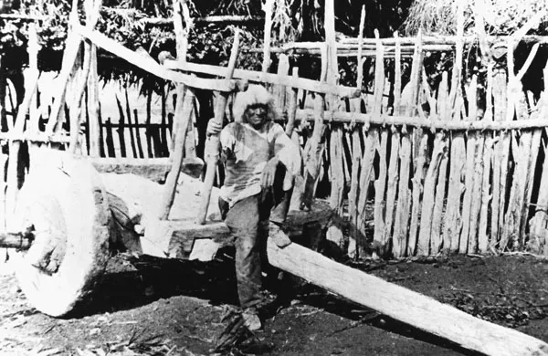 A Pueblo man seated on a traditional Spanish carreta, the principal means of transport in the Southwest for centuries. Behind is a jacal fence. © 1994 The Albuquerque Museum, Albuquerque Public Library Collection. Neg. No. 1978.141.001.