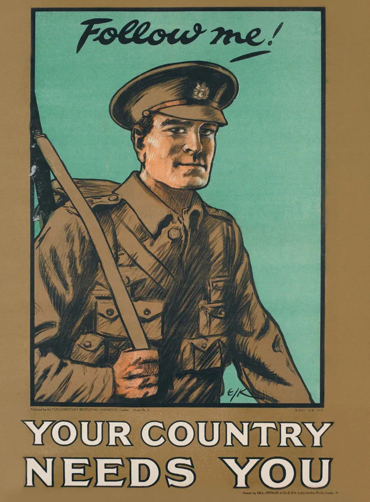Recruitment posters such as this one encouraged huge numbers of young men to volunteer to join the forces in the early months of the First World War.
