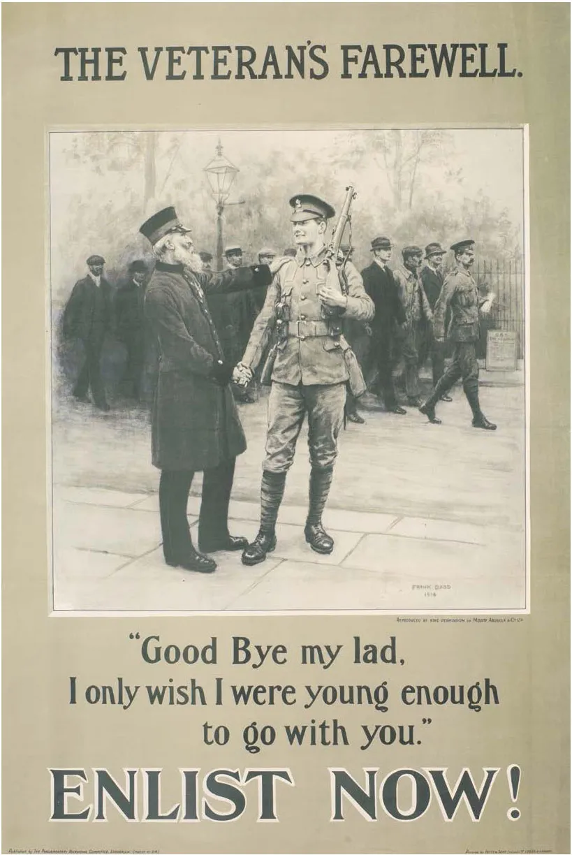 A recruitment poster depicting a veteran from an earlier war bidding farewell to a young soldier about to set off with his comrades for war with Germany.