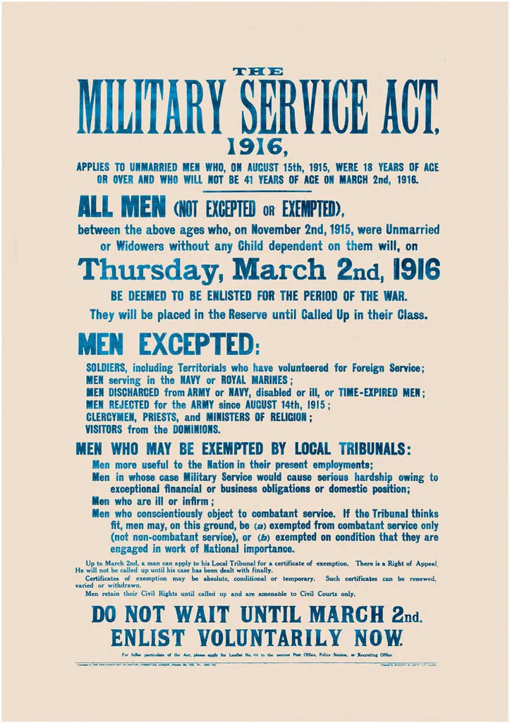 A poster detailing who could be called up and who was exempted under the terms of the Military Service Act of 1916.