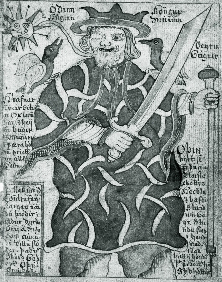 One-eyed Óðinn with his ravens and his spear Gungnir, in an eighteenth-century Icelandic manuscript.