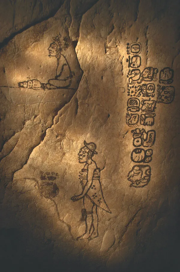 3. Maya art on the cave wall at Naj Tunich, Guatemala. Both the script and the identity of many of the personages in the art were worked out from Maya texts and ethnography (discussed in Chapter 7).