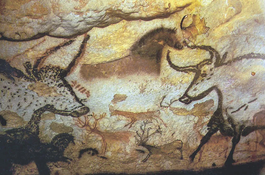 4. Upper Palaeolithic paintings dating to the Ice Age in the Hall of Bulls, Lascaux, France.
