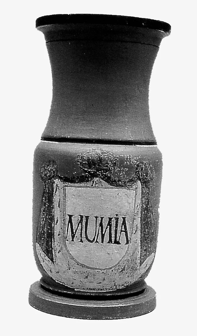 An 18th-century pharmacist’s ‘mummy pot’, from the Netherlands, used to store ground-up bog body parts for medicinal purposes. Dutch people still ingested these powders until the early 20th century.