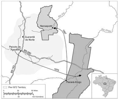 At the time of my fieldwork in Nansepotiti, the only means of access to the village was by small, single engine plane; although, since about 2007, there has been overland access by rough road. The flight takes about thirty minutes from the nearest town, Guarantã do Norte, which is one of many small towns that sprang up along highway BR-163 in the 1980s. Following the opening of the road between Santarém and Cuiabá, thousands of settlers were attracted to the area to find work in the open-cast goldmines around the Peixoto de Azevedo basin. Subsequently, the area was opened up to cattle farms, and more settlers followed, many coming from the southern states of Santa Catarina, Paraná, and Rio Grande do Sul. A large number were migrants who were being relocated after losing plots of land in other areas; others were so-called brasiguaios: Brazilians who had been living in Paraguay and had lost rights to land there.5 More recently, the area has been at the forefront of the timber logging frontier, which in turn has been followed by soybean cultivation. By 2005, the industrial scale cultivation of soy had reached Guarantã do Norte.