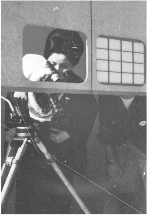 Figure 1.1 Hostess Soho Uyeda (Sowa Kai Omote Senke School of Tea), framing a shot during the shooting of The Path, Donald Rundstrom, Ronald Rundstrom, Clintum Bergum, USA, color, sound, 16 mm, 1971. Courtesy of Ronald Rundstrom.
