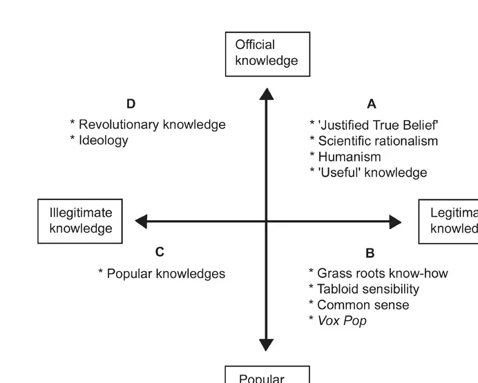 Figure 1 is something of a ruse (as is the as-yet unseen Table 1). I am not usually a fan of diagrams and tables because of their rigid appearance. The positions in Figure 1 are far from fixed and are dependent on external, contingent factors. All of the knowledges in position A, for example, could equally be in position D. What is illegitimate knowledge from one political position could be legitimate for another, depending on what legitimating criteria is drawn upon. I have, however, tried to provide a diagram that expresses the dominant ideology in the 'West' with regards to knowledge culture. The interventions that I will summarize and draw upon below arise from those disciplines that I feel to be the most helpful in preparing the ground to consider a particular dynamic evident in the diagram; namely, the tension between positions A and C. That is, I am interested primarily in questioning the relationship between knowledge that holds an officially 'legitimate' status and that which is considered to be of 'illegitimate' and popular status (at least from the vantage point of the 'official'). This is the tension that will organize the concerns of this book, though the other positions in Figure 1 will never be far from view and will occasionally take centre stage.