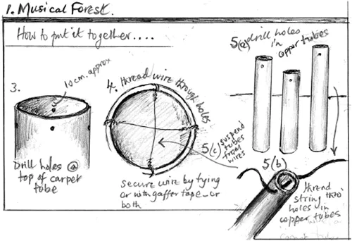 | At the start | The room is filled with a forest of trees suspended from the ceiling. The trees make musical chiming sounds when moved. The forest is made up of a series of cardboard tubes, decorated to look like trees. The Musical Forest makes an intriguing environment to explore during a drama or movement session or as an art installation in its own right. |