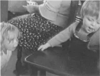 The first thing we notice is that they are using symbols, in other words they are transforming objects to help create new meanings. While the adults around her are playing house for real, Clare tells Sean to Come to my house, and her âhouseâ is represented by an upturned coffee table (Figure 2). Sean: In the house. Close the door. The table has enough features to be able to represent a house, the table top acts as a roof and entering the enclosed space gives the feeling of being inside (Figure 3). Clare: Doesnât fit you. Shall I get a little one for you? While they are both trying to squeeze into the house Clare echoes the language that surrounds her. Clare: Thank you. Please! Sit down, sit down.