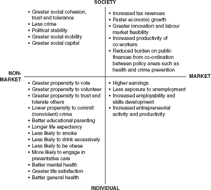 Figure 1.1 The Market and Wider Benefits of Higher Education to Individuals and Society.