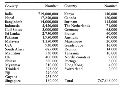 Table 1.1 gives some broad estimates for Hindu populations around the world (based on figures from the CIA World Factbook, Encyclopaedia Britannica Online, the Himalayan Academy, Barrett 1982, Thiara 1994, Prins 1994, Bilimoria 1997, Coward 1997, Baumann 1998, Rogers 1998a, Voigt-Graf 1998).