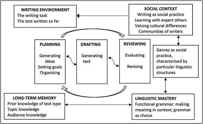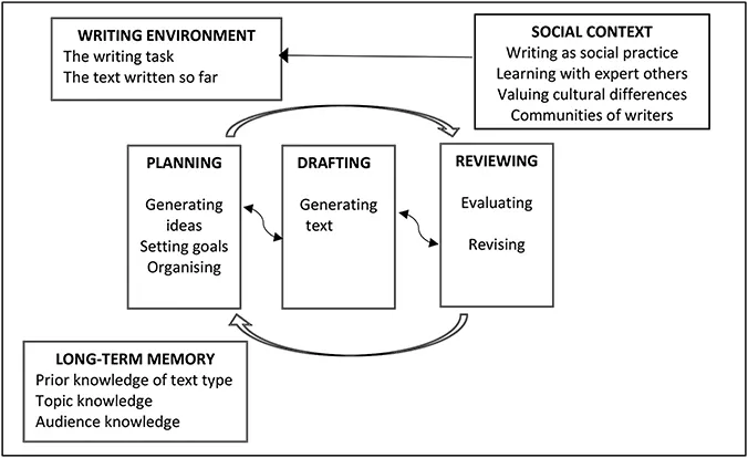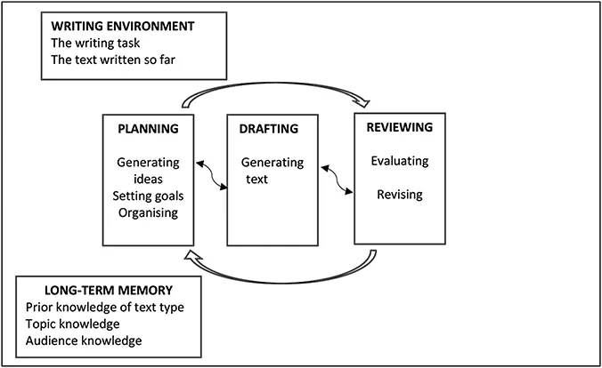 The first theoretical models of writing were cognitive, in other words, they focus on the mental processes we use to produce written text. Cognitive models of writing frame writing as a problem-solving process, in which we have to work out both what to say it and how to say it (Bereiter and Scardamalia 1987). The Hayes and Flower model (1980) was the first cognitive model (see Figure 1.1), and although there have been many variations and adaptations since, the core components have remained largely the same. This model identifies three principal components of the writing process ā planning, generating text, and reviewing. The planning process is not what we often think of in school settings as planning, that is, writing an outline plan of the text we are about to write. Rather cognitive models conceive of planning as a much broader process of thinking about and preparing to write, which includes, for example, researching a topic; generating ideas through activities such as freewriting, concept-mapping, notetaking; and thinking about the goals for writing ā what is the purpose for writing the text. The drafting process relates principally to getting text from ideas in the head into words on the page and may involve the production of multiple drafts before a final piece of writing is completed. The reviewing process is principally about judging the effectiveness of the text and revising it to make it more effective. Crucially, these three processes interact during the writing process: it is not a stage model of plan-draft-revise as is typical of many pedagogical approaches. It recognises the messy recursiveness of writing, and that when we are drafting we often generate new ideas, and that when we are planning we are often evaluating and selecting, as well as generating.