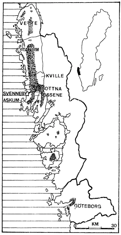 Representations of the human figure make up the second most common representational motif found in the rock carvings, and the county has the highest proportion and absolute number of human figures of all areas with prehistoric art in northern Europe. I shall confine myself to the rock carvings of the area north of the town of Munkedal, where most of the carvings are found (Figure 1.1). Although there are significant concentrations of carvings in Göteborg, and on the islands of Tjörn and Ărust, anthropomorphic figures are very rare. The material from the northern part of the county offers the best scope for exploring how sexuality was represented, therefore, in prehistory. Within this area I shall also limit myself to those areas of the county for which modern documentation exists - the hundreds of Kville (Fredsjö, Nordbladh and Rosvall 1971, 1975, 1981) and Vette (Yates n.d.) - and will exclude, therefore, the equally rich areas of Tanum, Tossene and Askum, for which no detailed documentation has taken place in recent years.