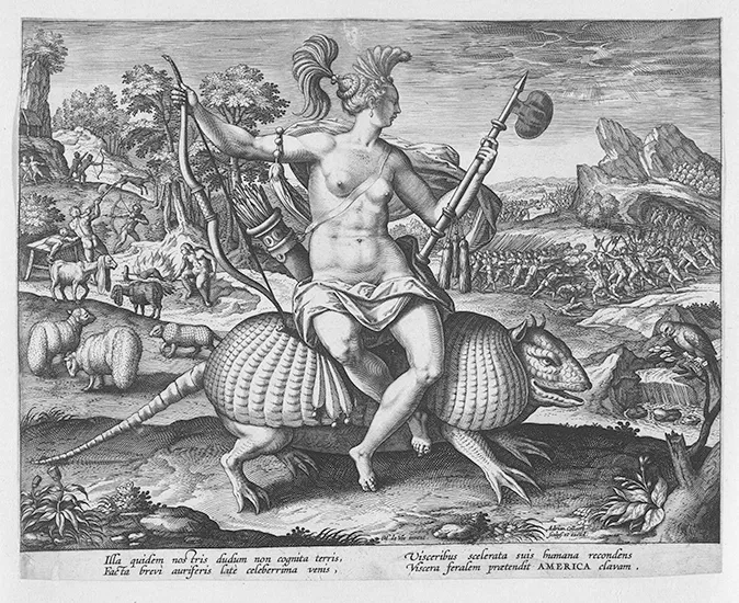 In an engraving called America, a Personification (c. 1590) by Flemish artist Adriaen Collaert, America is again a naked woman in a feathered headdress, armed with bow and arrows, riding a giant armadillo (see Figure 1.2). She turns her gaze to the right (the symbolic future, since English reads left to right), where naked people with axes battle armoured Europeans armed with guns. In the left background (the symbolic past), naked people hunt deer in a pastoral setting, a naked man butchers a human body with an axe, and a naked woman roasts a human leg on a spit. The message is that if left undominated, Indigenous people (especially women) resort to ungodly overconsumption, treating what Christians see as the very image of God—the human body—as mere meat. Once the image of the axe is connected with cannibalism, the European invaders on the right are fighting for their very lives (and for Christian values of the body) against an all-consuming enemy.