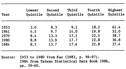 A third important aspect of Taiwan's development is the changes which have occurred in the income distribution. According to figures prepared by Kuo (1983) which are presented in Table 1.2, the share of income received by families in the top quintile of the income distribution declined significantly from 61 percent in 1953 to 37 percent in 1980 while that received by families in the lowest quintile increased from 3 percent to 9 percent. While the income distribution in general became much more equal, the distribution between urban and rural families followed a curvilinear pattern with increasing urbanization. Up to the early 1970s, the share ratio of income between the most rural counties and the largest cities decreased, but thereafter it increased (Kuo, 1983, pp. 109-116). This is contrary to the normal relationship whereby early development tends to increase inequality between urban and rural areas.