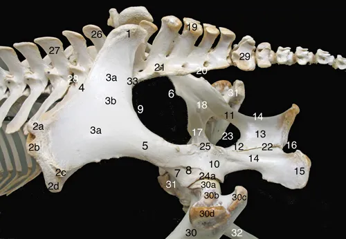 Pelvis and connected bones: 22- Pelvic symphysis; 23- Obturator foramen; 24- Acetabulum, 24a- Acetabular margin; 25- Ischiatic spine (sciatic crest); 26- Spinal process of the sixth lumbar vertebra; 27- Fourth lumbar vertebra; 28- Intervertebral foramen; 29- First caudal vertebra; 30- Left femur, 30a- head, 30b- neck, 30c- major trochanter (caudal part); 30d- major trochanter (cranial part); 31- Right femur; 32- Right tibia; 33- Sacroiliac joint.