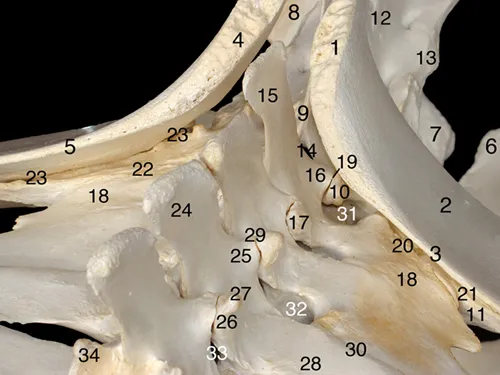 Lumbar vertebrae and sacroiliac joints: 15- Spinal process of L6; 16- Caudal articular process of L6; 17- Cranial articular process of L6; 18- Transverse process of L6 (fused with the transverse process of the fifth lumbar vertebra (L5)); 19- Left lumbosacral articular process joint; 20- Left lumbosacral intertransverse joint; 21- Left sacroiliac joint; 22- Right lumbosacral intertransverse joint; 23- Right sacroiliac joint; 24- Spinal process of the fourth lumbar vertebra (L4); 25- Caudal articular process of L4; 26- Cranial articular process of L4; 27- Mammillary process; 28- Transverse process of L4; 29- Left articular process joint between L3 and L4; 30- Left intertransverse joint between L4 and L5; 31- Dorsal lumbosacral intertransverse foramen; 32- Dorsal intertransverse foramen between L4 and L5; 33- Left intervertebral foramen between L3 and L4; 34- Right cranial articular process of the third lumbar vertebra.