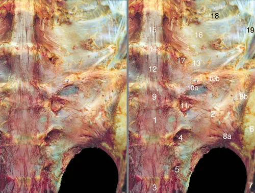 Sacrum: 9- Spinal process of the first sacral vertebra (S1); 10- (Cranial) articular process of S1; 11- Left transverse process of S1 (sacral wing); 12- Median sacral crest; 13- Lateral sacral crest; 14- Interarcual space between the last lumbar vertebra (L6) and S1;