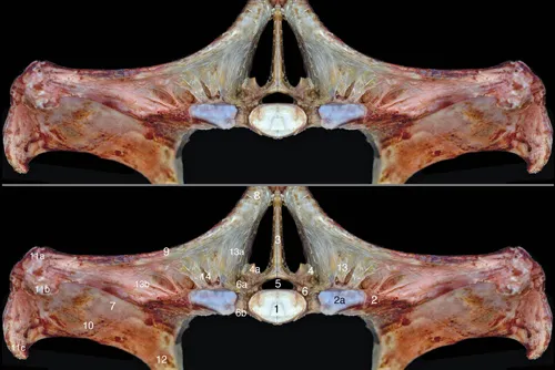 1- Body of the first sacral vertebra (S1); 2- Transverse process of S1 (sacral wing); 3- Body of the third sacral vertebra (S3); 4- First ventral (intervertebral) sacral foramen; 5- Second ventral (intervertebral) sacral foramen; 6- Ilium wing; 7- Ilium neck; 8- Sacroiliac joint covered by the ventral sacroiliac ligament, 8a- caudomedial part, 8b- craniolateral part (covered by the iliopsoas muscle); 9- Lumbosacral intervertebral disc (sixth lumbar (L6) disc); 10- Lumbosacral intertransverse joint, 10a- joint space, 10b- lumbosacral intertransverse ligament; 11- Ventral ramus of the sixth lumbar nerve; 12- Body of the sixth lumbar vertebra (L6); 13- Transverse process of L6 (fused with L5 transverse process); 14- Fifth lumbar intervertebral disc; 15- Body of the fifth lumbar vertebra (L5); 16- Transverse process of L5 (fused with L6 transverse process); 17- Ventral intertransverse foramen between L5 and L6; 18- Intertransverse ligament; 19- Iliolumbar ligament.