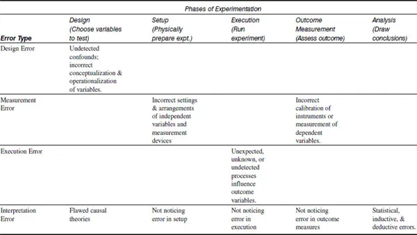 We distinguish five stages in the experimentation process: design (choosing variables to test), set-up (physically preparing the experiment), execution (running the experiment), outcome measurement (assessing the outcome), and analysis (drawing conclusions). Each stage is directly associated with a different category of error.