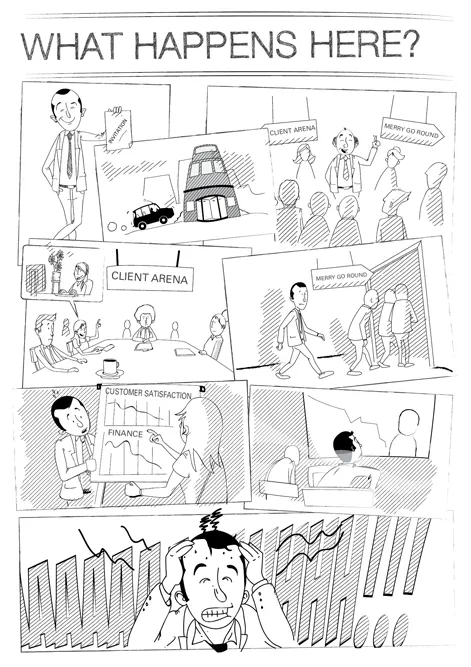 Phew, the arena discussion has finished. You now find yourself in a smaller group and head off to do ‘the merry-go-round’. You enter the financial room first, which contains a large sign with two lines. One line depicts the organization’s turnover: stable for the past four years. The other represents costs over the same period. Boy oh boy, they have risen! You see high-denomination banknotes strewn across the ground. Are they genuine? They appear to be the increased costs for the past year. A discussion ensues in the group, led by the CFO. Were we actually aware of this? Yes, we were in fact, but everyone thought that it would improve. A bell rings, signalling us to move to the next room. The customer room also features a large sign with two charts once again. They look very stable. The customer satisfaction rating has been 6.3 over the past years. The number of customers who recommend your organization to others constitutes 3 per cent of the total. That was 4 per cent in previous years. A clothesline with letters attached to it has also been hung up. Letters of complaint. In the background you continue hearing a friendly voice, apparently from the organization’s call centre. The voice repeats: ‘One moment please, no member of staff is currently available.’ A short discussion about customers is also held in this room. When was the last time you actually spoke to a customer? The bell rings, telling you to move along. Twenty minutes in one of these rooms fly by pretty quickly. As you leave the room the last thing you hear from the loudspeaker is ‘One moment please, no member of staff is currently available.’ The third room, the employees’ room, is filled with festive smiles and streamers. It also contains a large foam sign featuring a number of statements from employees and some figures. Employee satisfaction is 7.5. Wow, that is high. Engagement with one’s own work is 7.8, while engagement with the organization is 6.2. Source: the employee survey conducted last year. This cannot be true, surely? Financially, we are performing poorly, customers are dissatisfied and everyone here is happy? There goes the bell again. Off to the following room, which looks completely different. A sign reading ‘cinema’ is hanging above the door. Great! But it looks more like a haunted house when you enter. It is pitch dark with scanty lighting and smoke in the air. The film begins. It is a customer speaking about his investment-based savings scheme in which most of the premium was spent on costs rather than investments. He invested €17,000 in savings but the value now is a mere €1,430. He is in his late thirties and speaks into the camera in a very polite and controlled manner. You can see, though, that he is extremely disappointed and angry. It makes you think of Kafka. It makes you think of the company you work for. Your stomach aches and you feel nauseous. The bell rings for lunch. You do not really have an appetite.